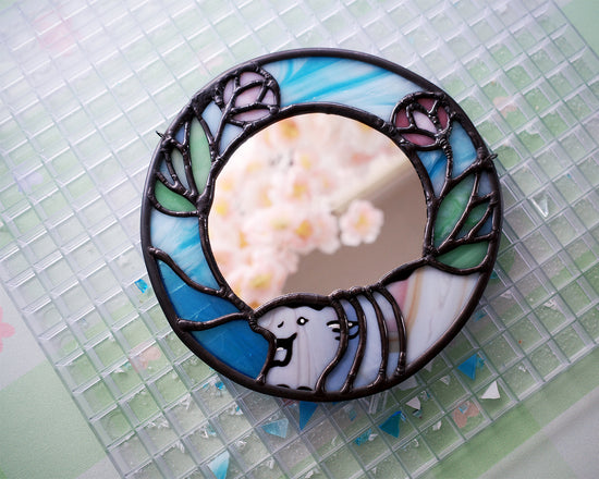 Hand-cut Stained Glass, using original pattern illustrated by Susan.Featuring the Pastel Picnic: Lily Deskmat.