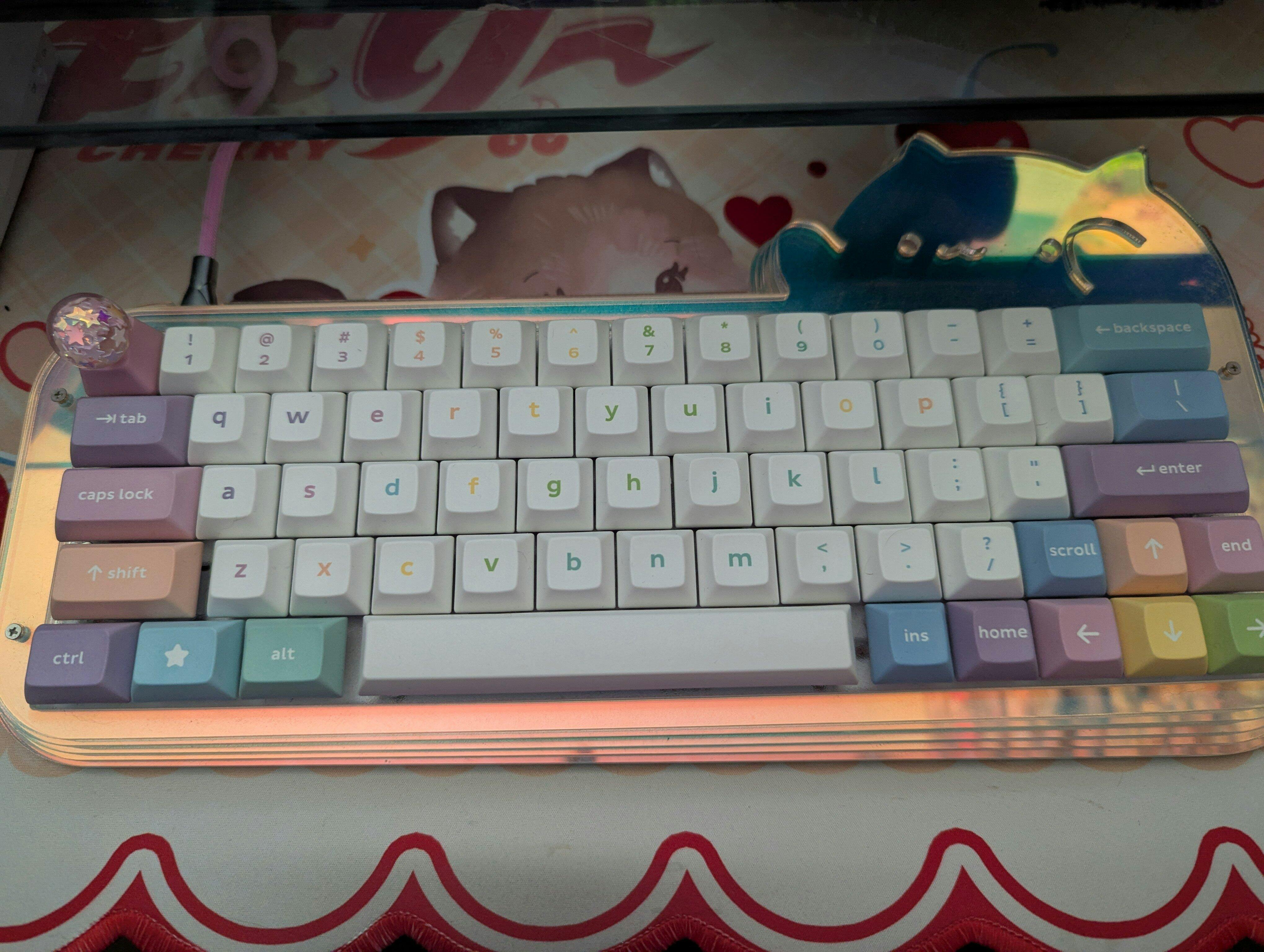 DSA Pastel Dreams keycaps featured on a TenKeyLess (TKL) keyboard. Crab Party Deskmat.