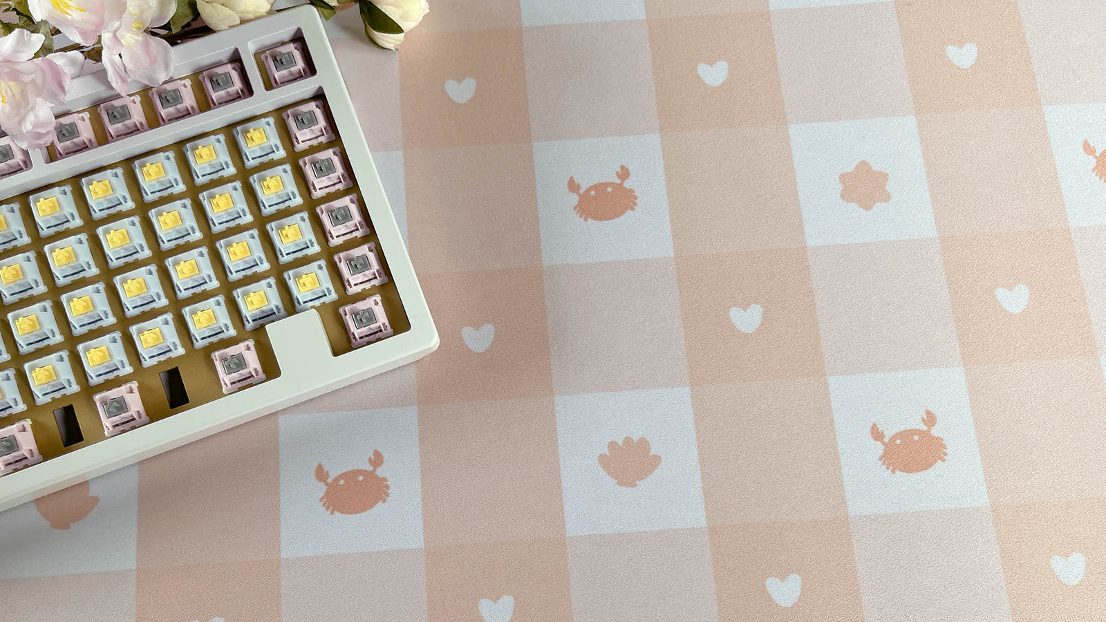 Set-up your desk with a lovely Pastel Picnic Deskmat in Beach. This light orange themed deskmat features crabs, hearts, and shells. Refreshed with for a lighter, brighter pastel look. Available in 2 sizes: Regular and Mini.