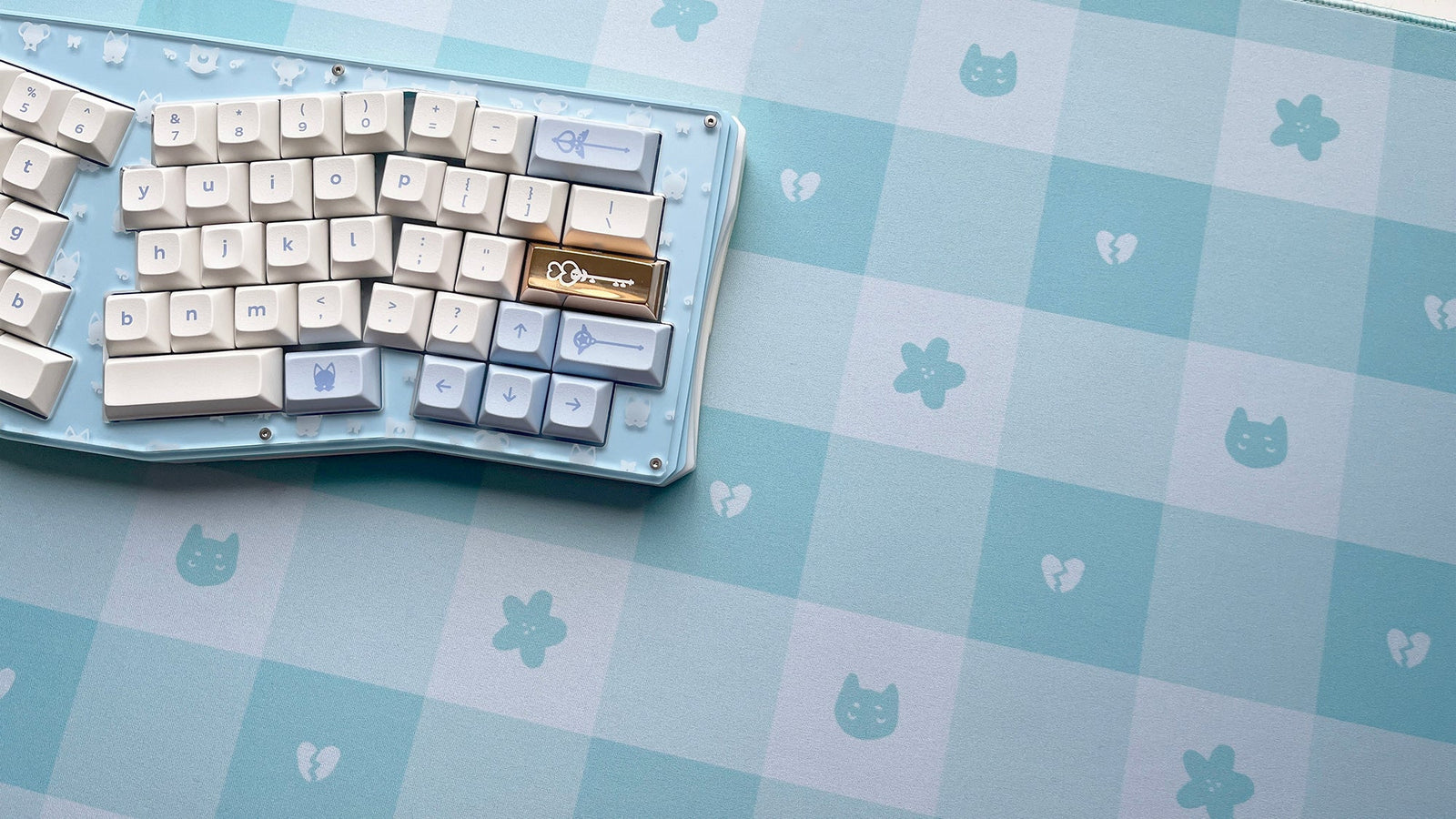 Set-up your desk with a lovely Pastel Picnic Deskmat in Sad Girl. This light blue themed deskmat features kitties, flowers, and broken hearts. Available in 2 sizes: Regular and Mini.