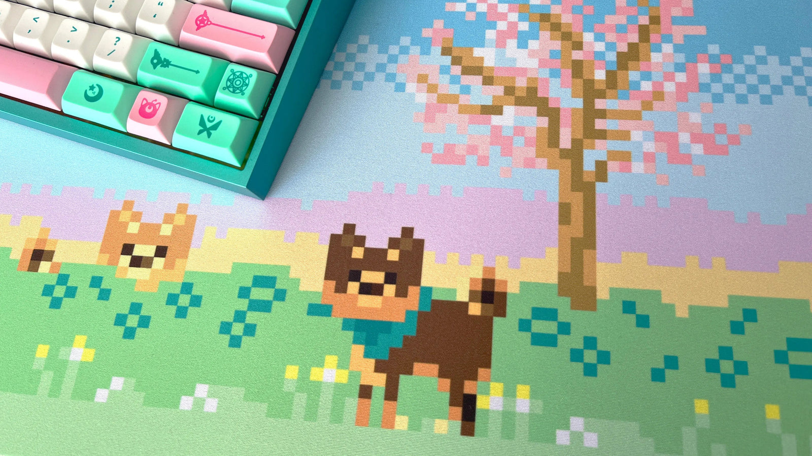 Pixel Shibas return for the second generation. Mango Roll is now joined by Grass Jelly in this adorable spring time themed deskmat. Pixel Art illustrated by Mintlodica, fun fact: originally for a game! and as part of our Pastel Dreams™️ series.