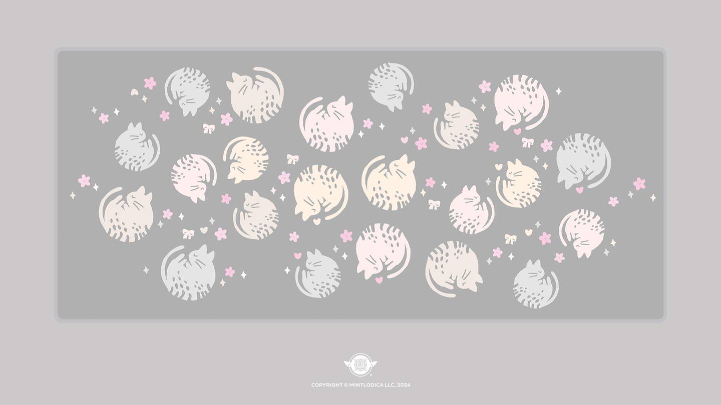 Sleeping Kitties Deskmat ft. neutral pastel sleeping cats alongside hearts, sakura flowers, bows, and sparkles.